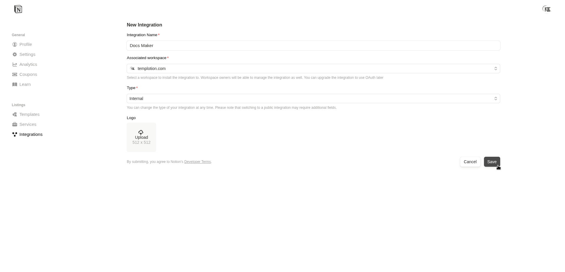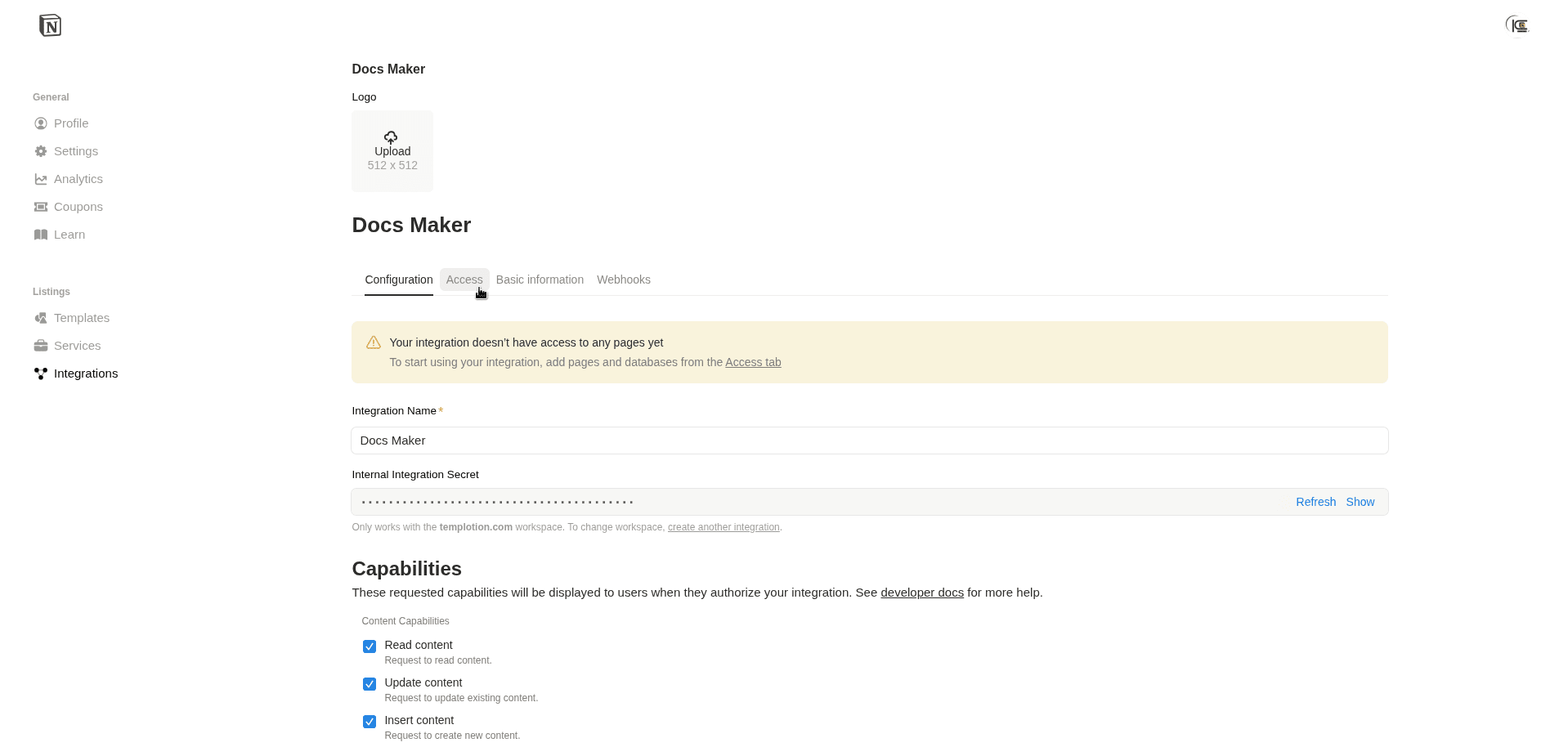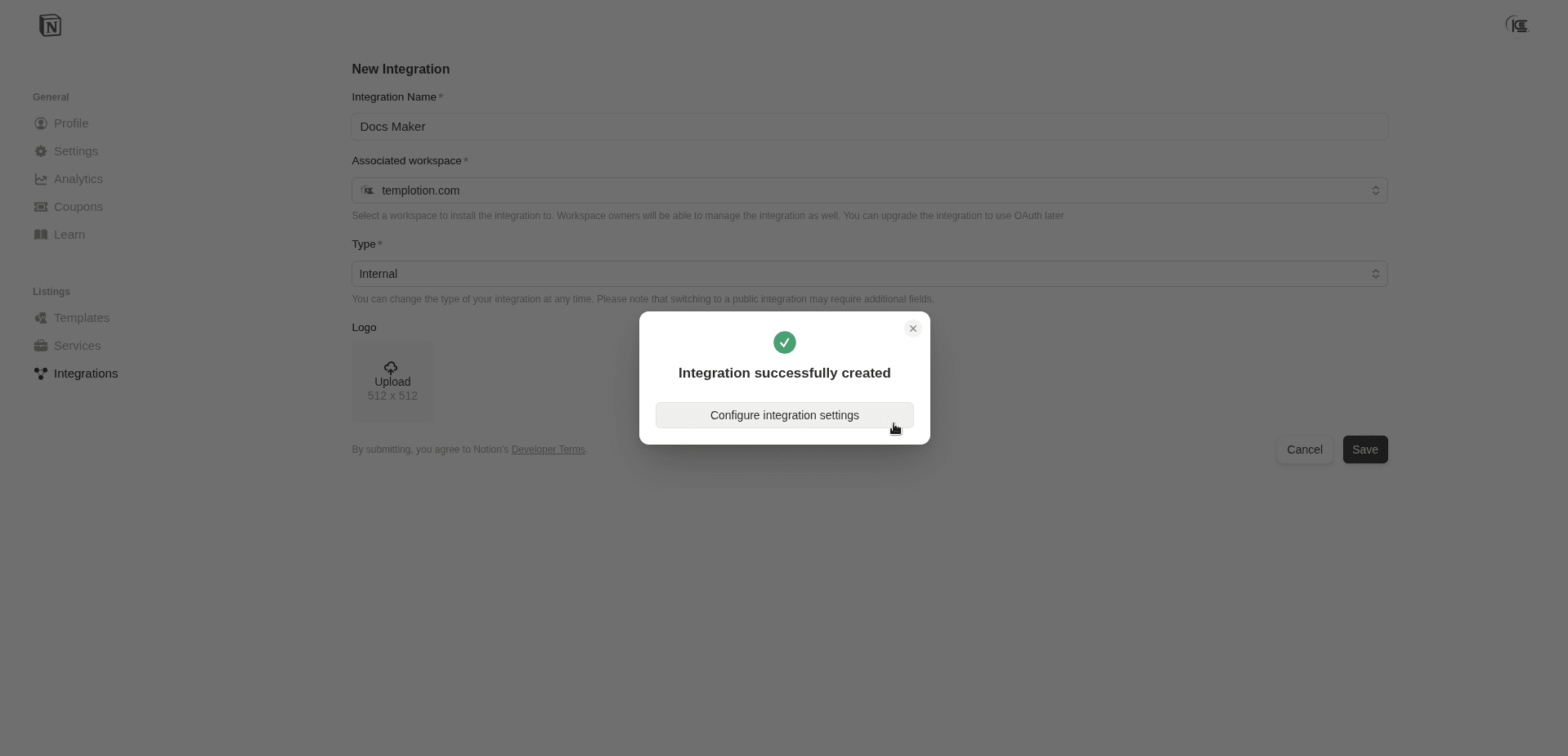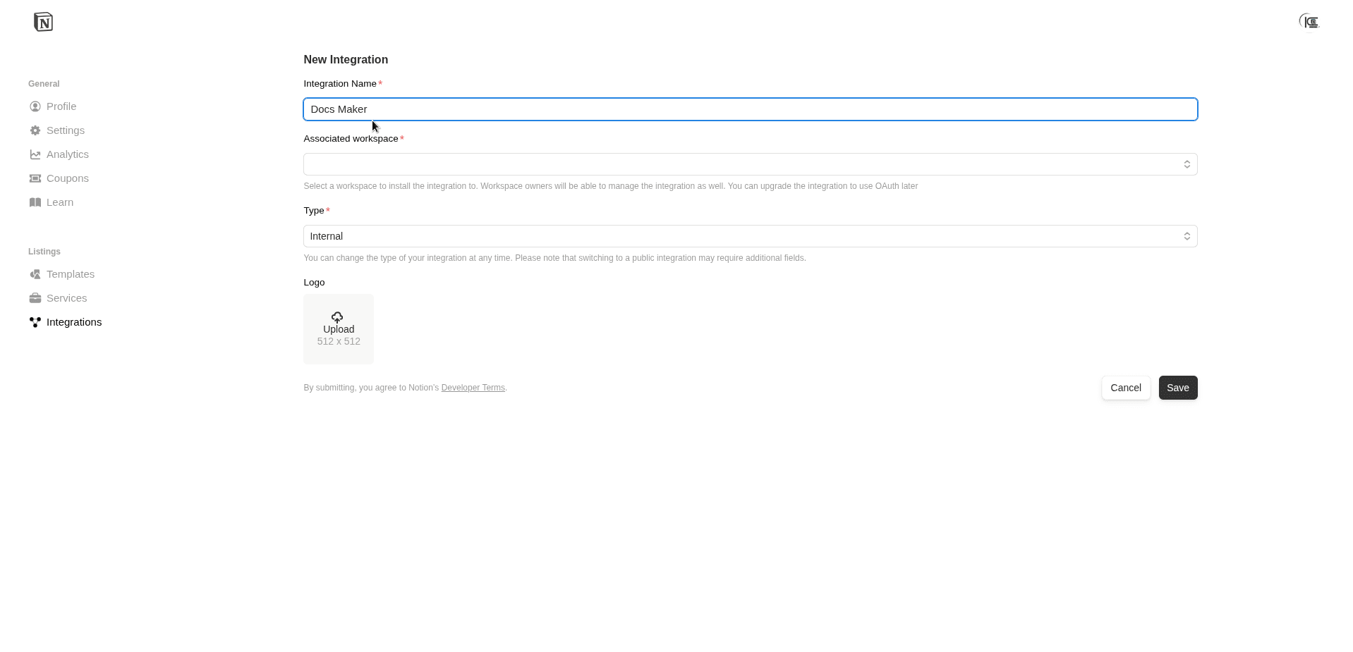 - Enter a name (for example, Docs Maker), select your Notion workspace, and save the integration.