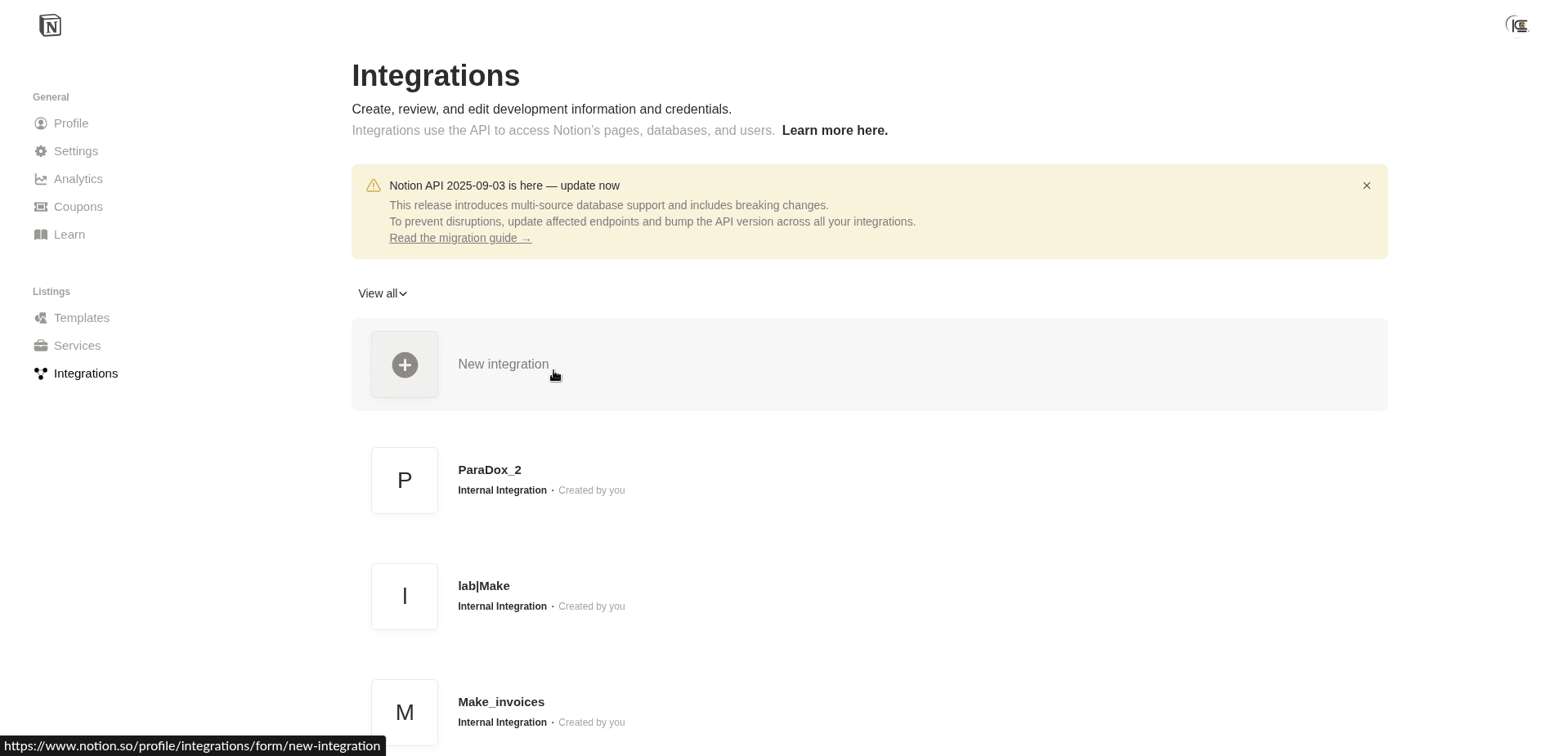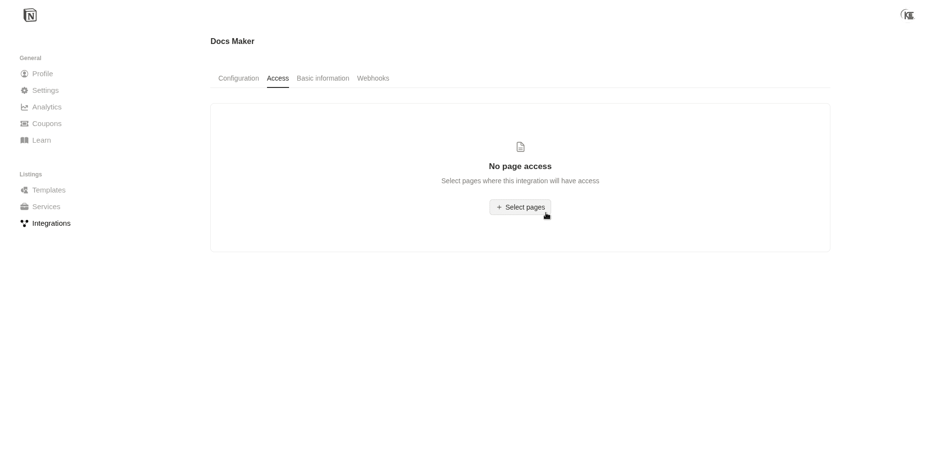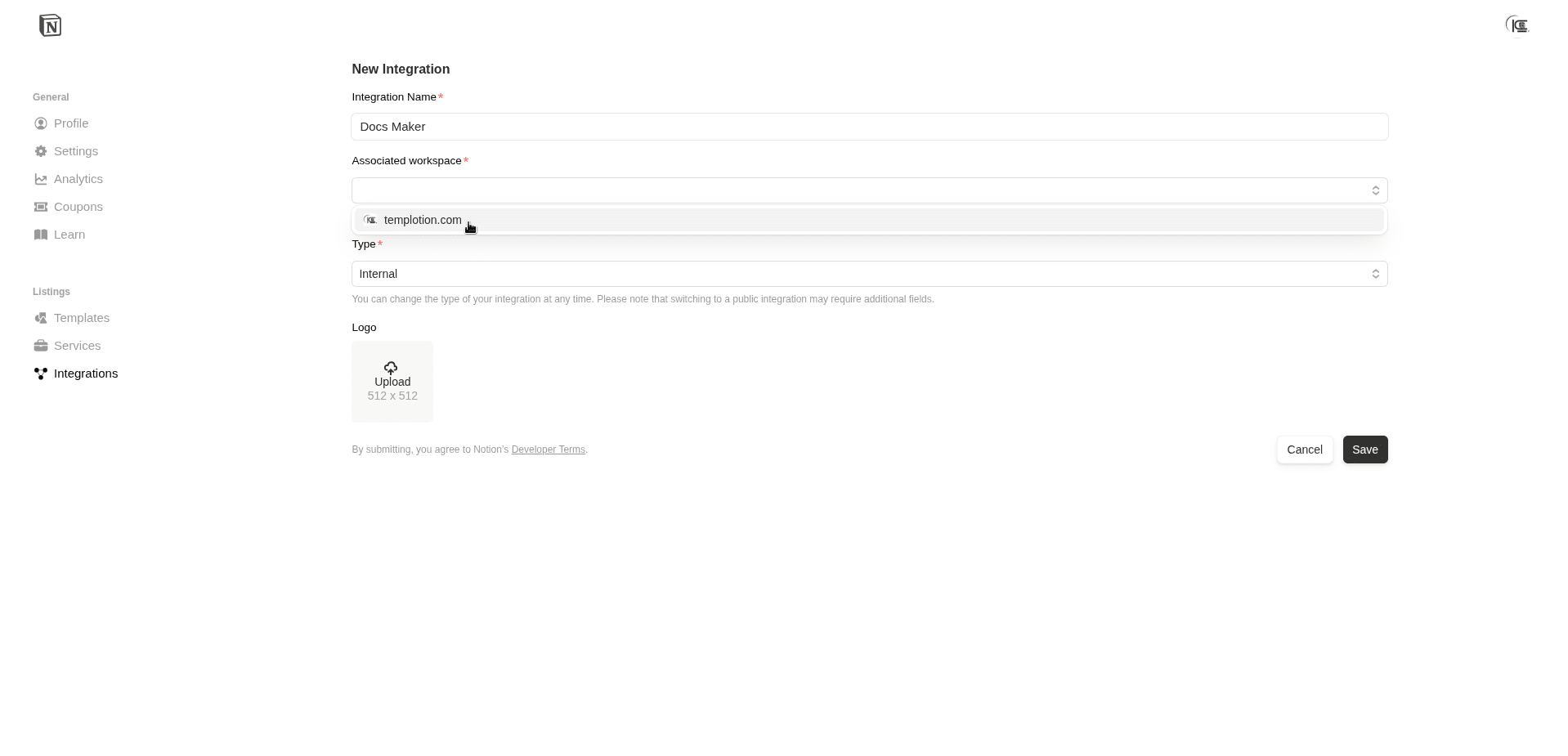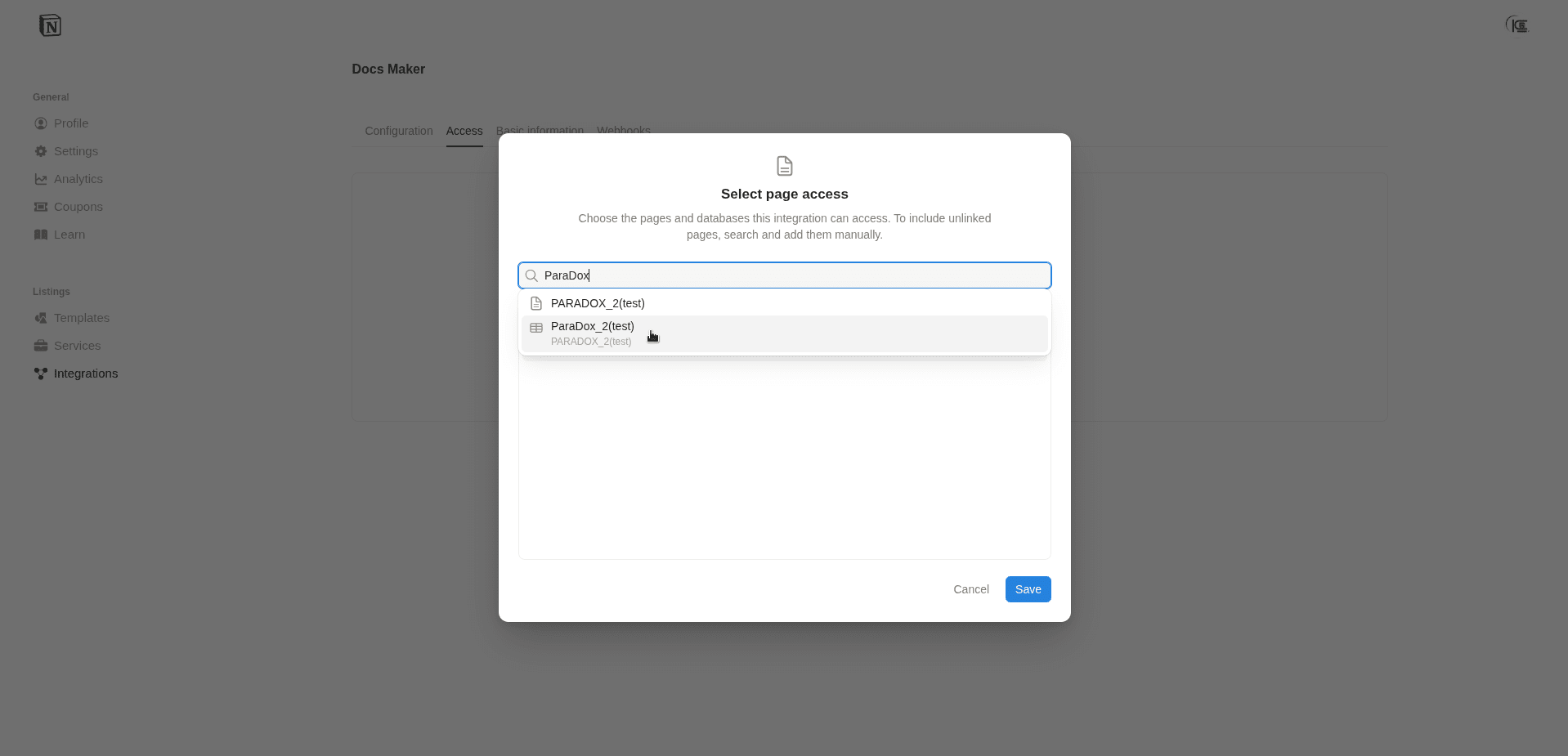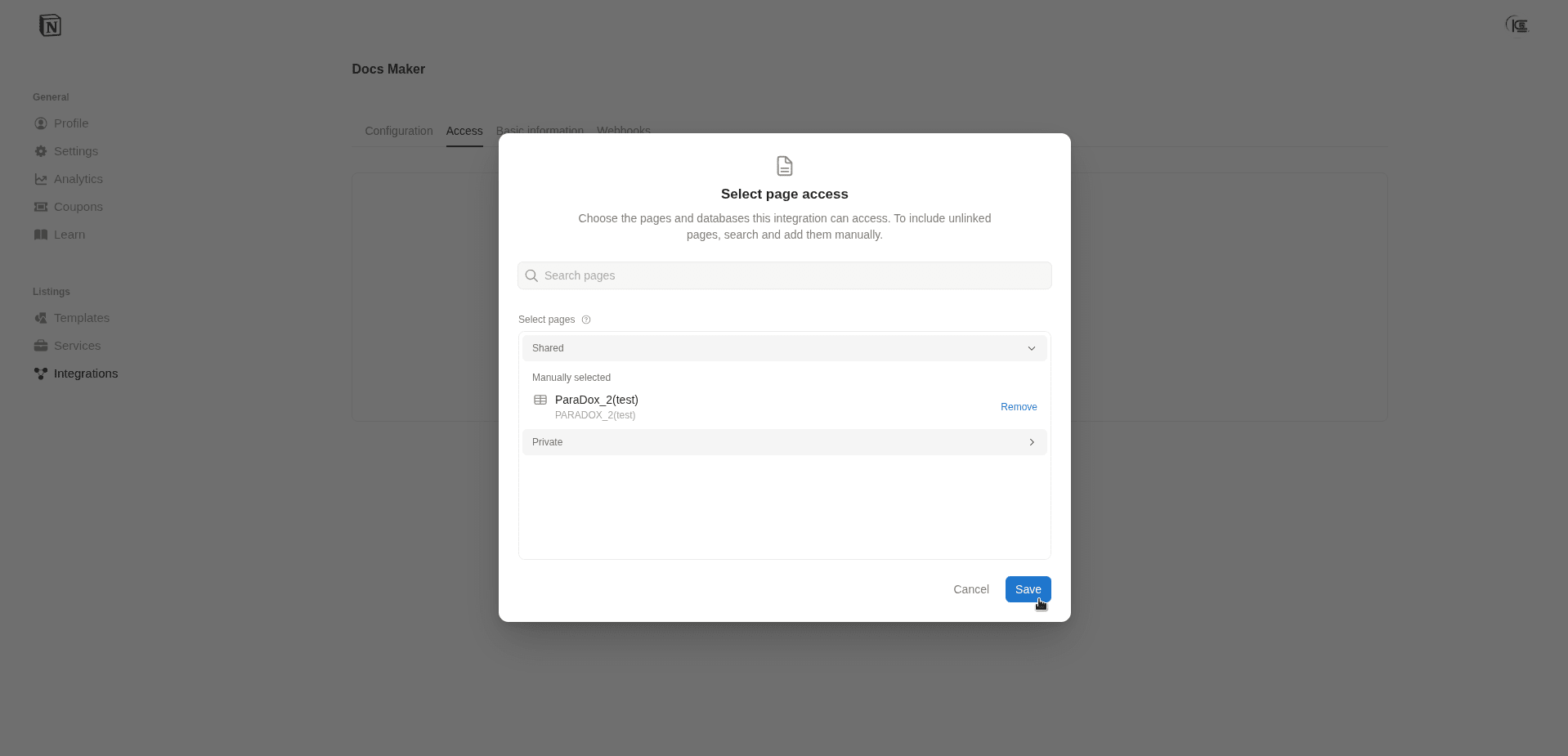 - Enter a name (for example, Docs Maker), select your Notion workspace, and save the integration.